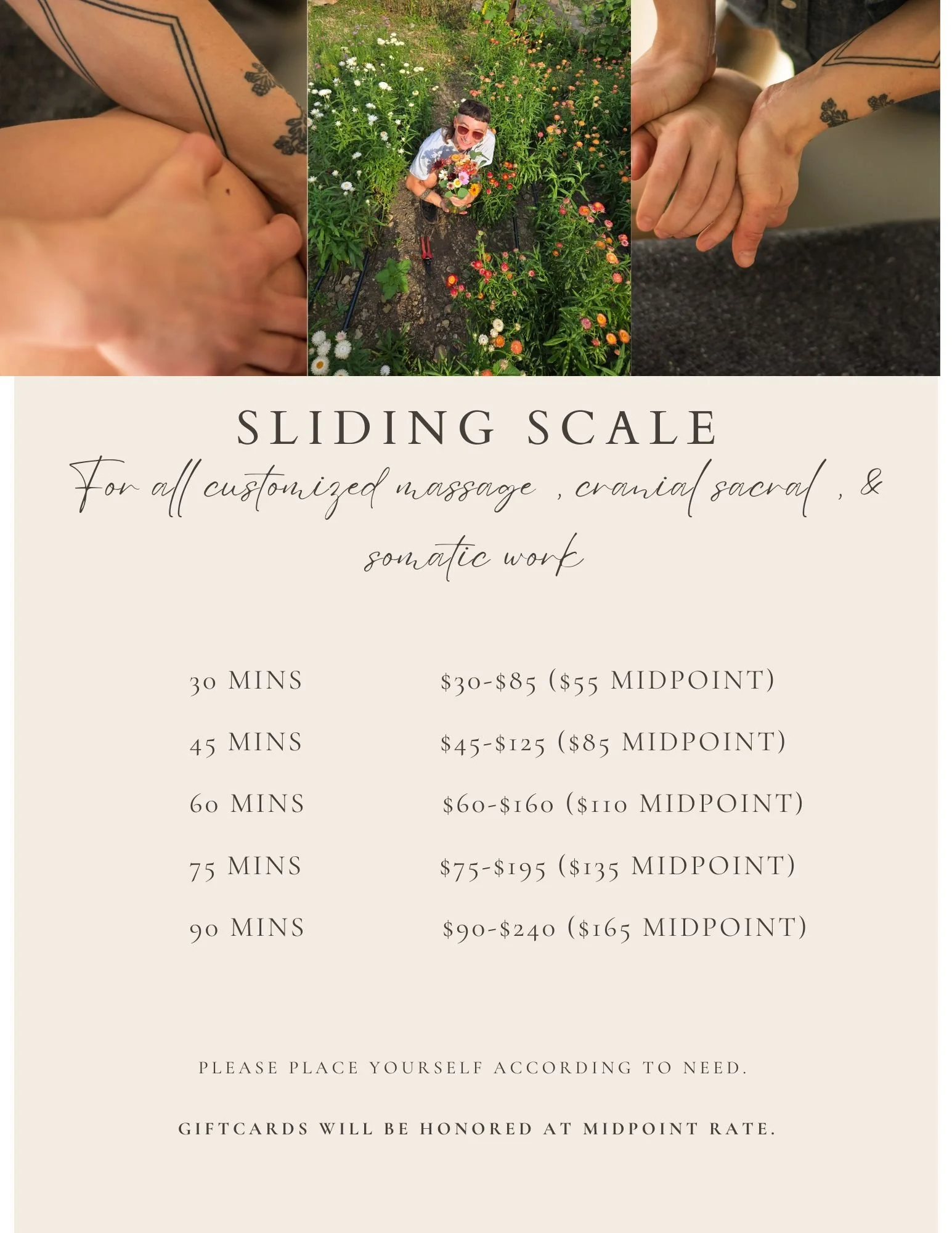 I believe that healing work should be accessible for all. It is preventative healthcare for the mind and body; not just a luxury for those with expendable income. As such, for my customizable bodywork sessions, cranial sacral work, and somatic work, I offer a sliding scale of $60-$160/hour, with $110/hour as the mid-point. This sliding scale applies to all services, but does not apply for gift cards , which are set at the mid-point of $110/hour.